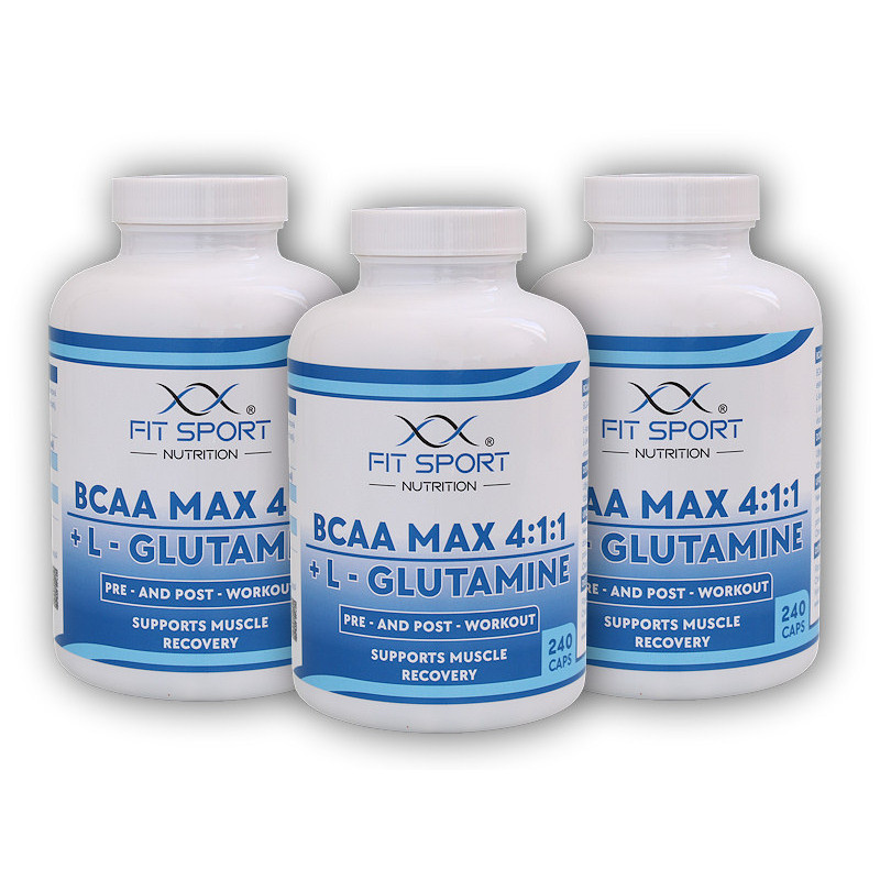 BCAA MAX 4:1:1 + L-GLUTAMINE je doplněk stravy obsahující esenciální aminokyseliny s rozvětveným řetězcem L-Leucin, L-Isoleucin a L-Valin ve speciálním poměru 4:1:1 ve prospěch L-Leucinu.