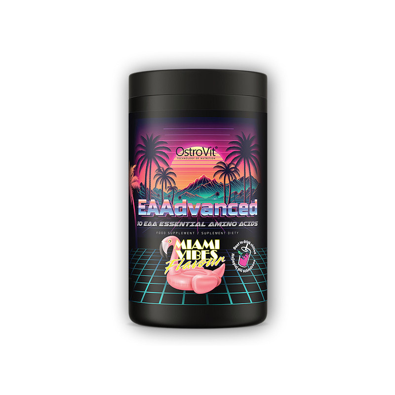 OstroVit EAAdvanced with Miami Vibes je vysoce kvalitní práškový doplněk stravy. Jedná se o komplexní živinu obsahující esenciální aminokyseliny (EAA), větvené aminokyseliny (BCAA) a cenné elektrolyty. Jde o produkt vytvořený pro fyzicky aktivní osoby, které mají zvýšené nároky na živiny obsažené v přípravku.