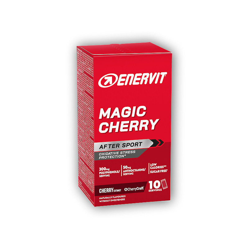 Enervit Magic Cherry je speciální višňový extrakt, který obsahuje vysoké množství (300 mg na dávku) polyfenolů a vitamín E s vysokou antioxidační silou. Tyto látky hrají důležitou roli v podpoře obranyschopnosti organizmu proti oxidačnímu stresu a působí proti volným radikálům vznikajícím během intenzivního fyzického cvičení. Tím významně podporují úplné a efektivní zotavení po vysoce intenzivních vytrvalostních výkonech.