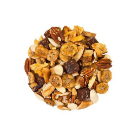Směs ořechů a ovoce, bez laktózy, bez lepku, veganské, -, Složení: Ananas, Banán, Kokos, Malina, Mandle, Pekanové ořechy, Balení: Uzavíratelný ZIPPER sáček